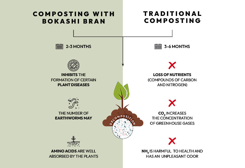 Anstelle der herkömmlichen Kompostierung im Freien werden bei der japanischen Bokashi-Methode spezielle Kleie mit Mikroorganismen zum Fermentieren Ihrer Abfälle verwendet. Durch dieses Verfahren entsteht in nur wenigen Wochen nährstoffreicher Kompost für Ihren Garten, und das alles ohne Gerüche. Außerdem entsteht ein Dünger, wie „flüssiges Gold“, der Ihren Pflanzen einen zusätzlichen Schub gibt!
