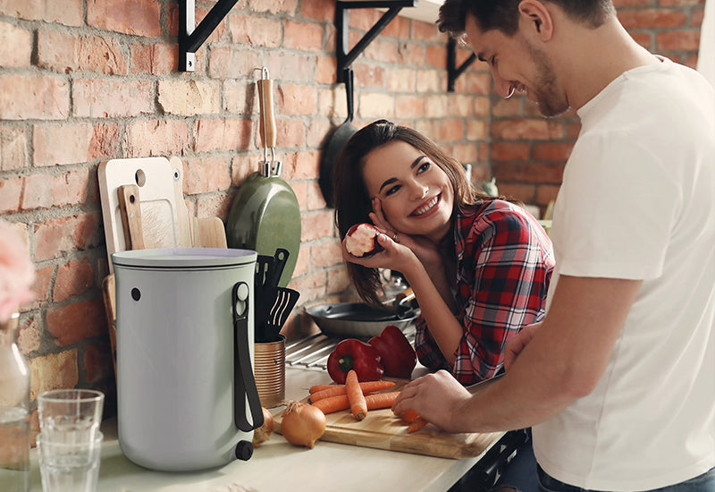 Sammeln Sie mit Organko Daily täglich Essensreste und gären Sie sie dann in Ihrem Bokashi-Behälter zu nährstoffreichem Kompost. Vom Design her sind diese beiden eine perfekte Kombination für Ihre Küchentheke.